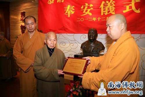 在仪式上,印顺大和尚首先向来自全国各地二十余座寺院的寺院代表颁发了本焕长老舍利恭请证。