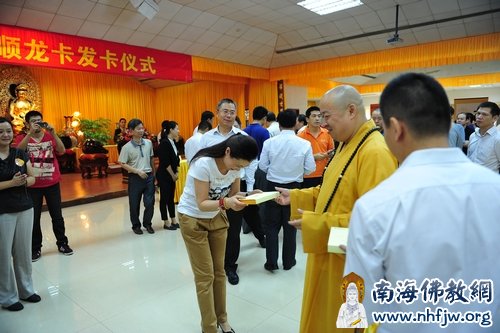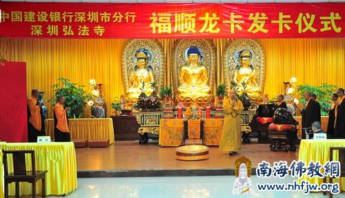 2012年10月16日讯 深圳地区首张佛教主题银行卡,上周日在弘法寺正式问世。14日上午,建设银行深圳市分行(深圳建行)与弘法寺在弘法寺经堂举办了隆重而庄严的“福顺龙卡”发卡仪式。深圳建行行长刘军、弘法寺印顺大和尚等出席了本次活动,与400余名建行客户与员工一起见证了“福顺龙卡”正式面市。