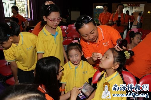 唱诵组的义工们首先为小朋友们唱诵了一曲非常好听的《南无消灾延寿药师佛》,希望孩子们能够“消灾延寿、健康成长,快乐生活”。在义工们亲切耐心的引导下,台下的孩子们也都纷纷双手合十,喊出他们稚嫩的甚至是口齿不清的一句“阿弥陀佛”。随着节目的进行,开始还很有些拘谨的孩子们脸上开始笑开了,心扉也打开了……
