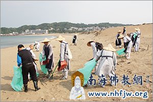 将岸边垃圾一片片拾起,如同将心中烦恼一件件放下。在僧袍外套著工作服的法鼓山僧伽大学30多位学僧、师长及热心的民众,于2013年3月20日下午2时顶着烈阳,前往近两公里长的金山磺溪口海滩,以实际的净滩行动,展现对于大地孕育众生的感念。