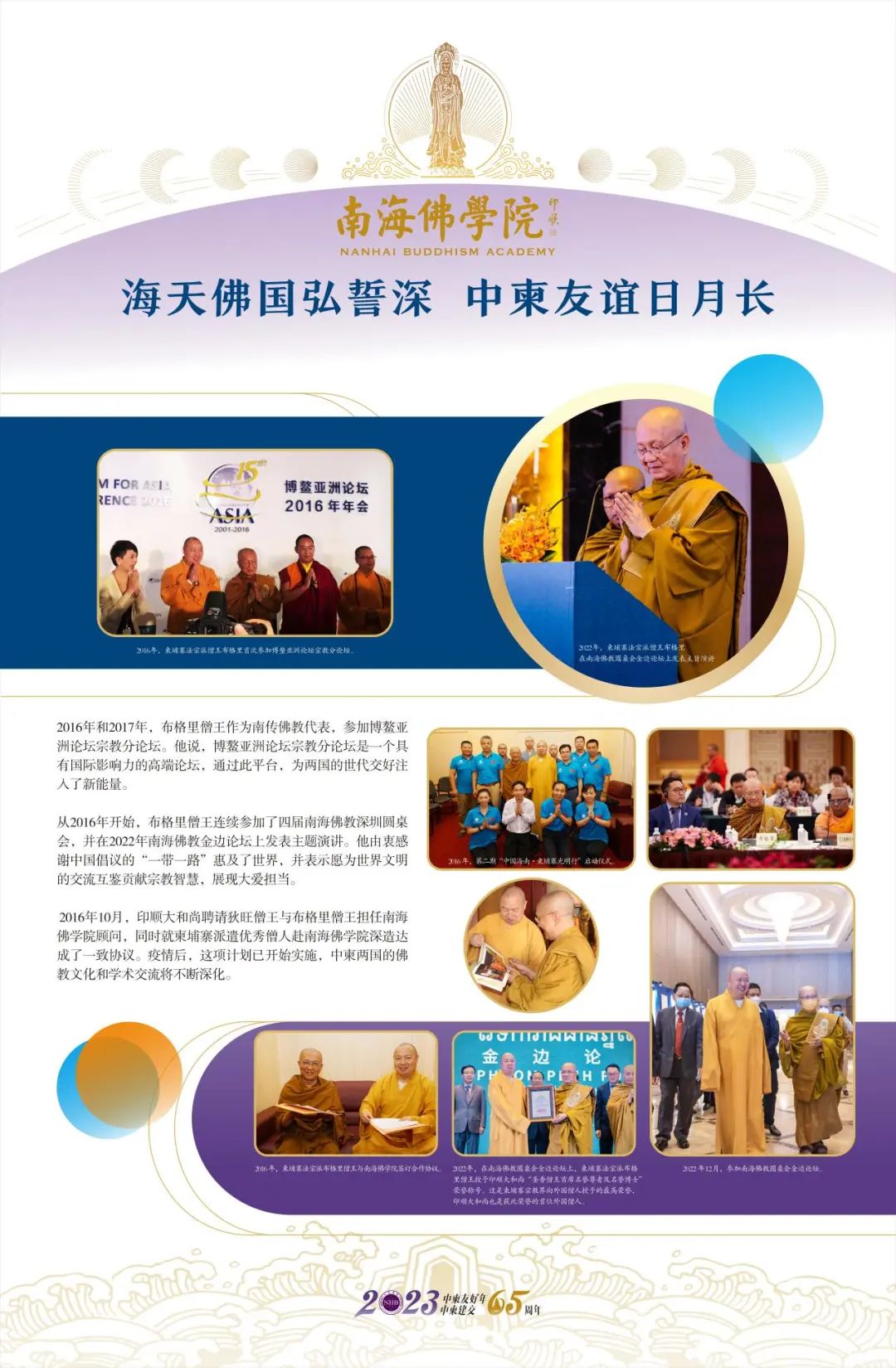 大道同行 和合共生 汇聚丝路华彩慧光 继2022年第七届南海佛教圆桌会 柬埔寨金边论坛之后 2023年12月10日至13日 第八届南海佛教圆桌会将 移师印度洋“佛法之岛” 于斯里兰卡首都举办 科伦坡论坛及系列活动 敬请期待 ▲科伦坡冈嘎拉马寺 今年是中柬建交65周年 在南海佛教圆桌会科伦坡论坛即将举办之际 我们用12集的篇幅 回顾中柬法谊走过的历程 带您走进金边论坛的高光时刻 2022年12月18日,柬埔寨暹粒的清晨,透着丝丝凉意。疫情后久别重逢的两位老友,相聊甚欢。聊着聊着,只见其中一位将自己身上的披风取下,披给了另一位,像对兄长般地用手将披风整理妥帖。 对于这份来自中国老友印顺法师的体贴关心,布格里僧王眼含笑意、双手合十,这幅亲切的画面,也让现场暖意绵绵。因为僧王的慈悲,他的名字,“布格里”(谐音不隔离),成为疫情期间坊间流行的吉祥语。 以柬埔寨国王西哈莫尼名字命名的禅修中心落成典礼上,两位老友和现场数百民众正翘首期待西哈莫尼国王的到来。只见国王一下车,便始终双手合十,慈悲而谦恭地向民众示意,并与布格里僧王和印顺大和尚亲切交谈,面含微笑。 西哈莫尼国王和布格里僧王都盛赞印顺大和尚在推动两国佛教界的友好交往中做出的巨大贡献,并表示要共同祈请印顺法师把大乘禅法留在柬埔寨,留在西哈莫尼禅修中心。 印顺大和尚也表示,欢迎有经验的柬埔寨学僧与中国南海佛学院进一步拓展禅修文化交流,下一步将把西哈莫尼禅修中心作为中国学僧的禅修实习基地,以此促进中柬两国佛教深入交流。 ▲2016年博鳌论坛 2016年和2017年,布格里僧王作为南传佛教代表,参加博鳌亚洲论坛宗教分论坛。他说,博鳌亚洲论坛宗教分论坛是一个具有国际影响力的高端论坛,通过此平台,为两国的世代交好注入了新能量。 从2016年开始,布格里僧王连续参加了四届南海佛教深圳圆桌会,并在2022年南海佛教金边论坛上发表主题演讲。他由衷感谢中国倡议的“一带一路”惠及了世界,并表示愿为世界文明的交流互鉴贡献宗教智慧,展现大爱担当。 ▲2016 年,印顺大和尚会见布格里僧王,布格里僧王与南海佛学院签订合作协议。 2016年10月,印顺大和尚聘请狄旺僧王与布格里僧王担任南海佛学院顾问,同时就柬埔寨派遣优秀僧人赴南海佛学院深造达成了一致协议。疫情后,这项计划已开始实施,中柬两国的佛教文化和学术交流将不断深化。