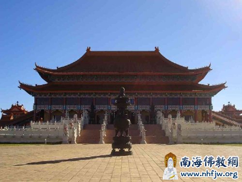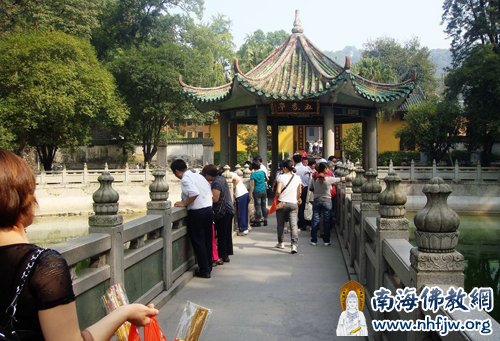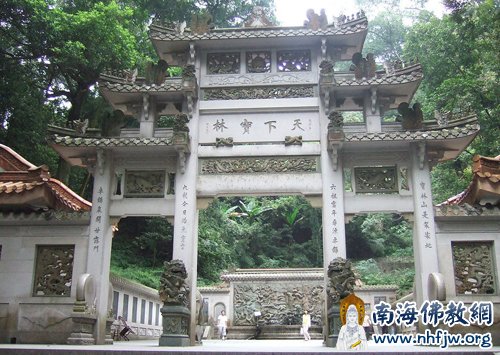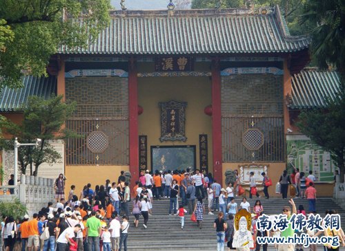 南华禅寺位于韶关市曲江区马坝镇以东7公里曹溪河畔。据明万历《曹溪通志》记载:南朝梁武帝天监元年(公元502年),印度高僧智药三藏见此地“山水回合,峰峦奇秀,叹如西天宝林山也”,遂建议地方官奏请武帝建寺。天监三年(公元504年),寺庙建成,梁武帝赐额“宝林寺”。唐仪凤二年(公元677年)始,中国佛教禅宗创始人六祖惠能大师来宝林寺说法37载,使南宗禅法大播于天下。故南华寺素有南禅祖庭之称,还与嵩山少林寺并称为禅宗祖庭,在东南亚、朝鲜、韩国、日本以及欧美等国家和地区有重要影响。武则天万岁通天元年(公元696年),武则天赐慧能水晶钵盂、磨衲袈裟等物。唐神龙元年(公元705年),中宗又赐宝钵、磨衲袈裟等物,并将寺名赐改为“中兴寺”;神龙三年(公元707年)再改“法泉寺”。宋开宝元年(968),太祖赐额改称“南华禅寺”,沿称至今。1983年,南华寺被确定为全国重点寺庙。今南华寺占地总面积约42.5万平方米,主体建筑群总面积1.2万平方米。为阶梯式中轴线对称平面布局。寺向为坐北朝南。中轴线上由南至北依次为曹溪门(头山门)、放生池(上筑五香亭)、宝林门(二山门)、天王殿、大雄宝殿、藏经阁、灵照塔、祖殿、方丈室。自天王殿始作封闭,东侧依次为钟楼、客堂、伽蓝殿、斋堂等;西侧依次为鼓楼、祖师殿、功德堂(亦称西归堂)、禅堂、僧伽培训班等。主体建筑院落外,北侧有卓锡泉(俗名九龙泉)、伏虎亭、飞锡桥;西侧有无尽庵、海会塔、虚云和尚舍利塔;东侧有中山亭。